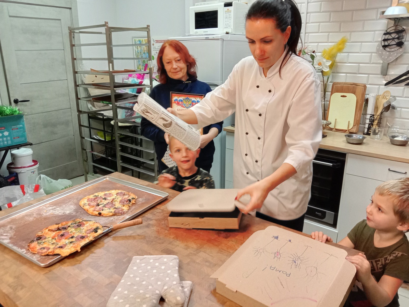 В завершении мастер-класса ребята сложили приготовленные пиццы в коробки, собственноручно оформленные рисунками.